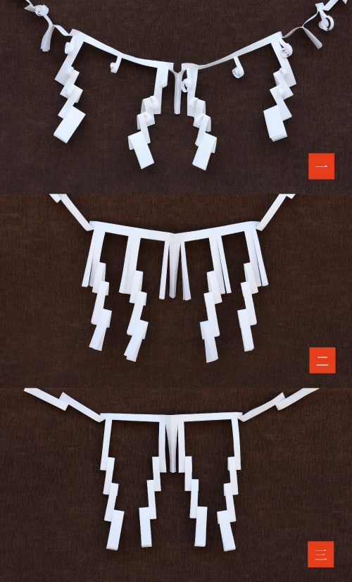 - 「神床」の注連、「祖霊」の注連は中央の折りしろ(谷折り)が神床に向かうように掛けてください。